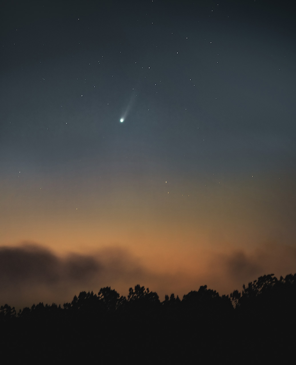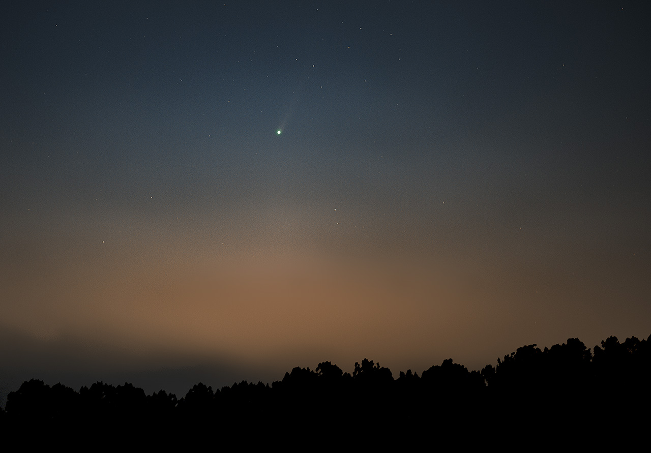 Guide 9 told me when the comet would rise, but it emerged from the fog in its own good time. By the time it did, the morning sky had brightened enough to hide all but about a degree of the comet's tail. The comet now begins to swing between the Earth and the Sun. What happens in the evening sky in a couple of weeks is anybody's guess. The show will be low in the western sky and well to the south. In the meantime, here are two last looks in the morning sky.