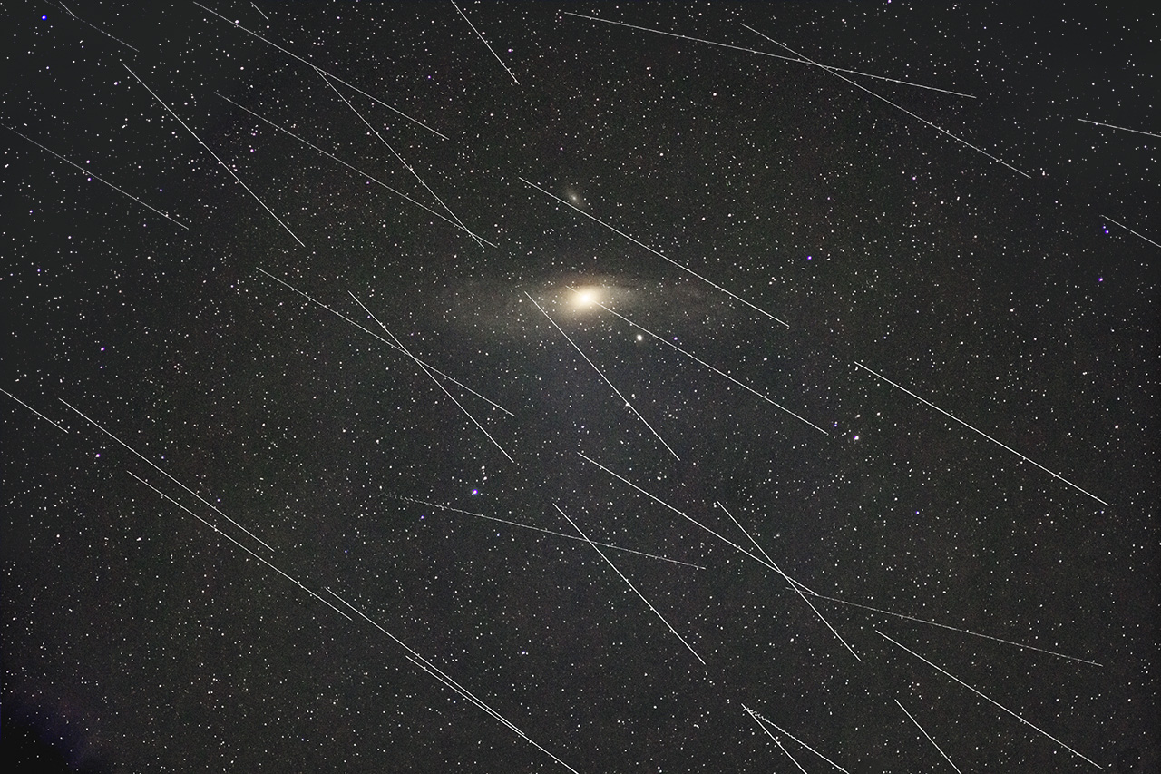 This is what happens if you press the shutter button manually to begin a series of exposures on a less-than-rock-solid mount. Don't do that. Or toss frame one, or use a hat trick, or a remote release. (You'll find this satellite trail just right of center at the bottom of the frame above.)